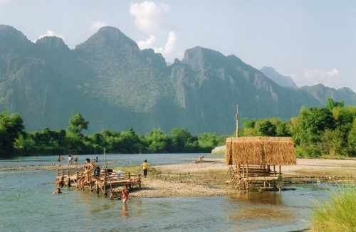 Samedi 18 novembre – Le séminaire est terminé, je pars en bus local pour Vang Vieng depuis la gare du Talat Sao. A 9h30, le bus est presque plein. Ma voisine m’offre des fruits. Un Belge – le seul Occidental avec moi – m’emprunte mon guide. Un étudiant qui rentre pour le week-end, se retourne souvent. Il finit par me dire que ses parents ont une guest house à Vang Vieng avec des chambres pas chères, 6 $ la nuit. La route s’élève et le paysage devient très beau. Le vent qui passe à travers les fenêtres ouvertes nous rafraîchit. De nombreux jeunes voyageurs, des étudiants sans doute, descendent. Le bus se vide.