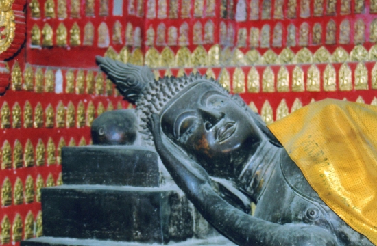 Il fait un peu moins chaud, je traverse la gare routière, longe les murs repeints à neuf de l’ambassade des E.U. et m’arrête pour boire un jus de mangue rue Samsenthai. La nuit tombe lorsque j’arrive au Vat Si Saket. L’endroit est paisible, sombre. De jeunes bonzes souriants se dirigent vers la prière du soir. L’un s’adresse à moi en anglais. Il a envie de parler et tant pis pour la prière : il a droit à dix absences par mois.