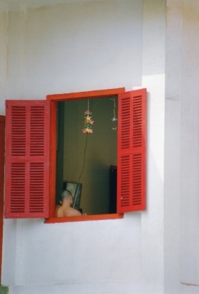 Vers 8h, le Vat Mai est encore dans la grisaille. J’écoute les commentaires érudits, d’un guide Indonésien parlant français. La lessive sèche autour du puits. Je passe près d’un lycée et d’une marchande de lames. La brume s’est évanouie. J’arrive au Vat Visoun, le plus ancien temple de la ville, construit en 1513, détruit par les pirates Ho des Pavillons noirs en 1887 et reconstruit en 1898. Très belle collection de bouddhas en bois. Au Vat Aham, deux énormes banians servent d’autels aux génies de la ville.