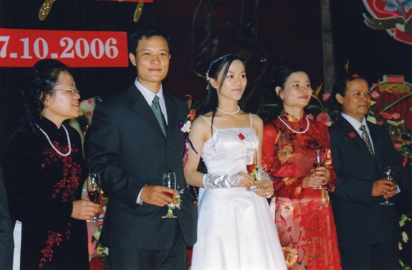 Puis on s’installe aux tables disposées dans l’immense salle pour attendre l’entrée des parents et des mariés. Un maître de cérémonie professionnel veille au respect du cérémonial. Ngoc et Giang suivent le tapis rouge qui les conduit à l’estrade, au son de la marche nuptiale de Mendelssohn et sous une pluie de confettis et de rubans. Devant un large rideau où sont inscrits leurs prénoms en lettres dorées sur fond rouge, les jeunes mariés échangent les alliances. Le père du marié remercie les convives. La mariée en robe blanche et le marié en costume sombre découpent la gigantesque pièce montée et font couler le champagne dans les coupes disposées en pyramide.